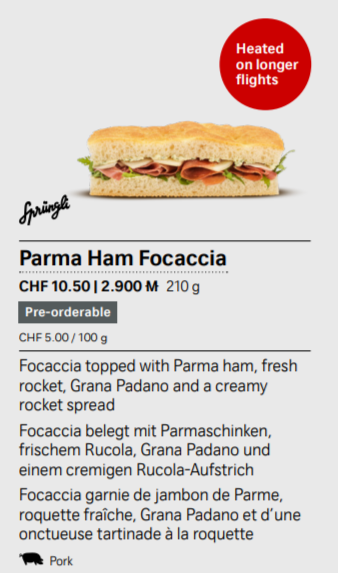 • Parma Schinken Focaccia für 10,50 CHF (wird auf längeren Flügen ebenfalls erhitzt)