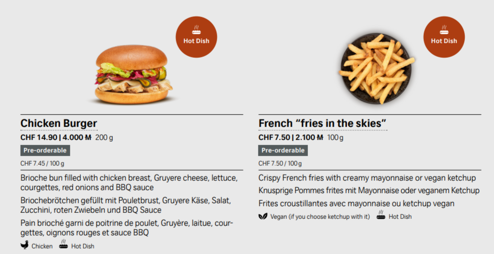 Wer die Speisen seiner Wahl vorab bestellt, erhält einen Rabatt in Höhe von 10%. Sparen könnt Ihr außerdem, wenn Ihr Euch für den Schweizer Apero, bestehend aus der Aufschnittplatte und einem Wein für 25 CHF entscheidet. Das Poulet-Sandwich mit einem Softdrink oder Heißgetränk eurer Wahl könnt Ihr im Bundle für 13,50 CHF kaufen und dabei bis zu 2,90 CHF sparen.  Oder aber Ihr entscheidet Euch für Chicken Burger und Pommes zum Preis von 20,00 CHF.