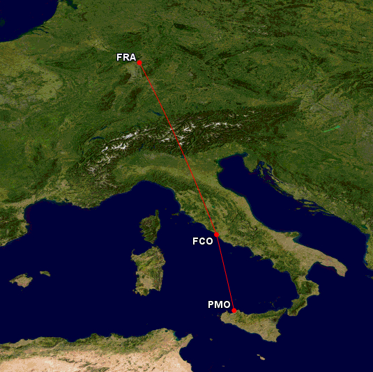 Interessant dabei ist, dass der A320 von Condor in Palermo übernachtet. Die Ankunft des Fluges ist spätabends in Palermo, und als einer der ersten Flüge des Tages geht er dort auch wieder los. Insbesondere auf dem Weg von Deutschland nach Italien ist es unspannend für Urlauber, sich nach Palermo durchzubuchen. Denn der A320 hat drei Stunden Aufenthalt in Rom, ehe es zum endgültigen Ziel des Tages weitergeht.