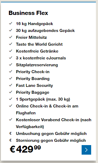 Der Priority Check-In und Lounge Zugang sind ebenfalls Leistungen der Business Class. Mit etwas Glück erwischt man ab Frankfurt oder Düsseldorf den Einsatz eines Airbus A330-200, welcher dann eine komplett flache Business Class an Bord hat und auf diesen kurzen Flügen natürlich ein Highlight ist.
