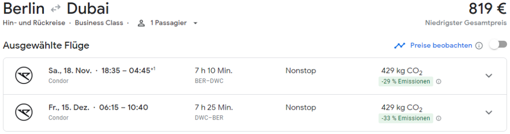 [Update] Leser Oliver wies in den Kommentaren noch darauf hin, dass Condor die Business Class scheinbar in Y bucht. Demnach wäre die Meilengutschrift bei Alaska Airlines nur 125% bis 250% der Entfernungsmeilen. [Update Ende]Condor Business Class Angebote: Hin- und Rückflug von Berlin nach Dubai ab 820 Euro | Frankfurtflyer Kommentar