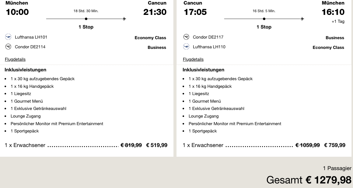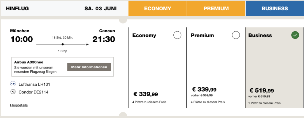 Vereinzelt starten die Preise für den Roundtrip schon ab 1.200€, die Verfügbarkeiten im Juni 2023 sind ziemlich gut. Zum Teil sind Zubringerflüge in Economy Class (z.B. München, Hamburg, Berlin…) für einen geringen Aufpreis zu haben, so kostet ein Trip von Berlin via Frankfurt (Lufthansa Economy Class) nach Cancun (Condor Business Class) und wieder zurück teilweise nur 1.255€.