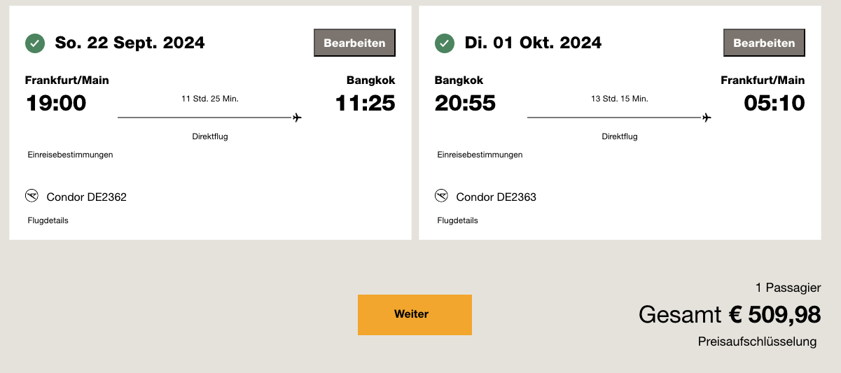 Die Trips sind auch als oneway ab 220€ buchbar (Rückflüge), so kann man diese mit anderen Airlines oder Prämienflügen kombinieren. Hier ein Beispiel für den Direktflug von Frankfurt (FRA) nach Bangkok (BKK) Ende September/Anfang Oktober und dem entsprechenden Rückflug: