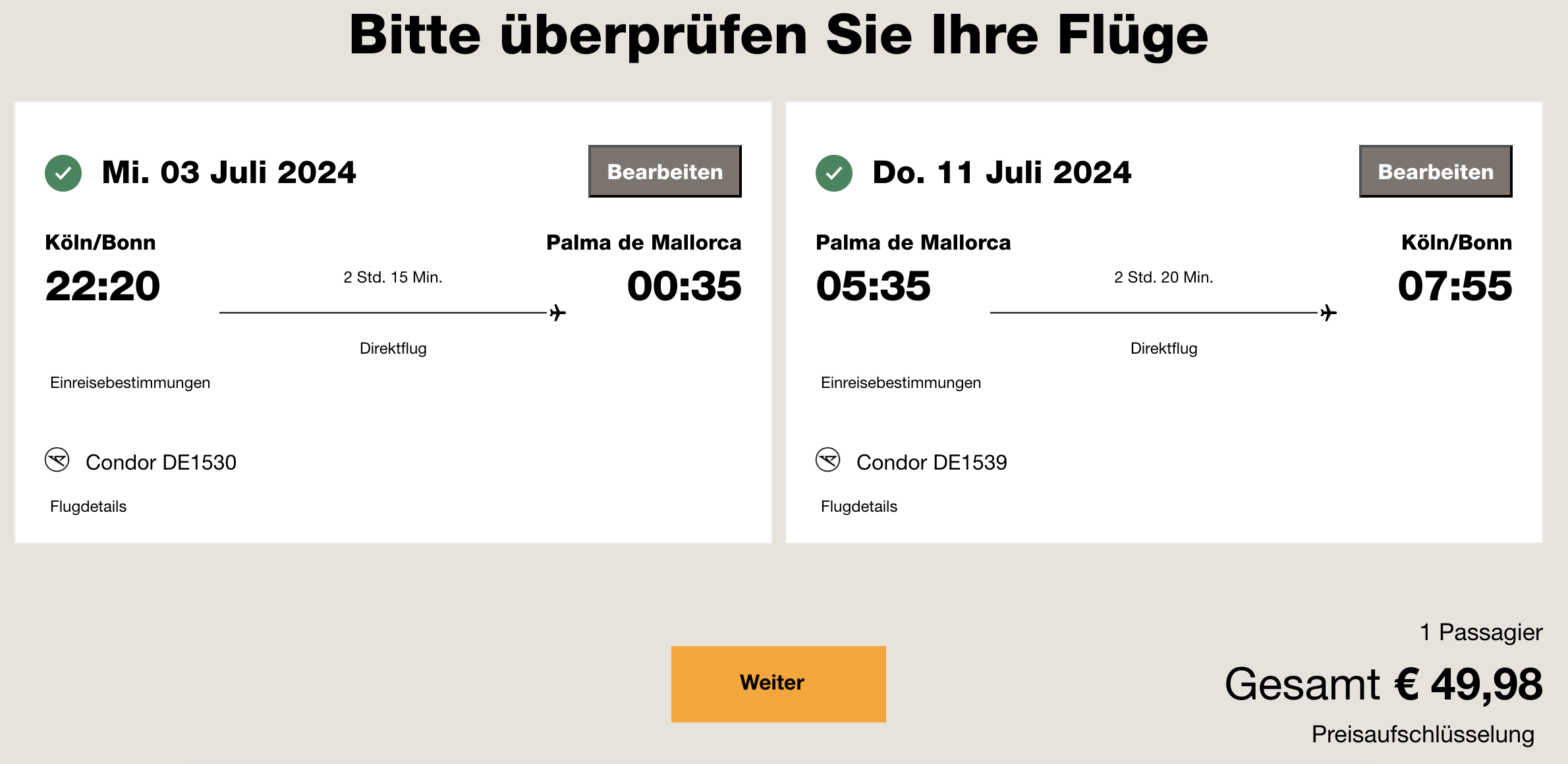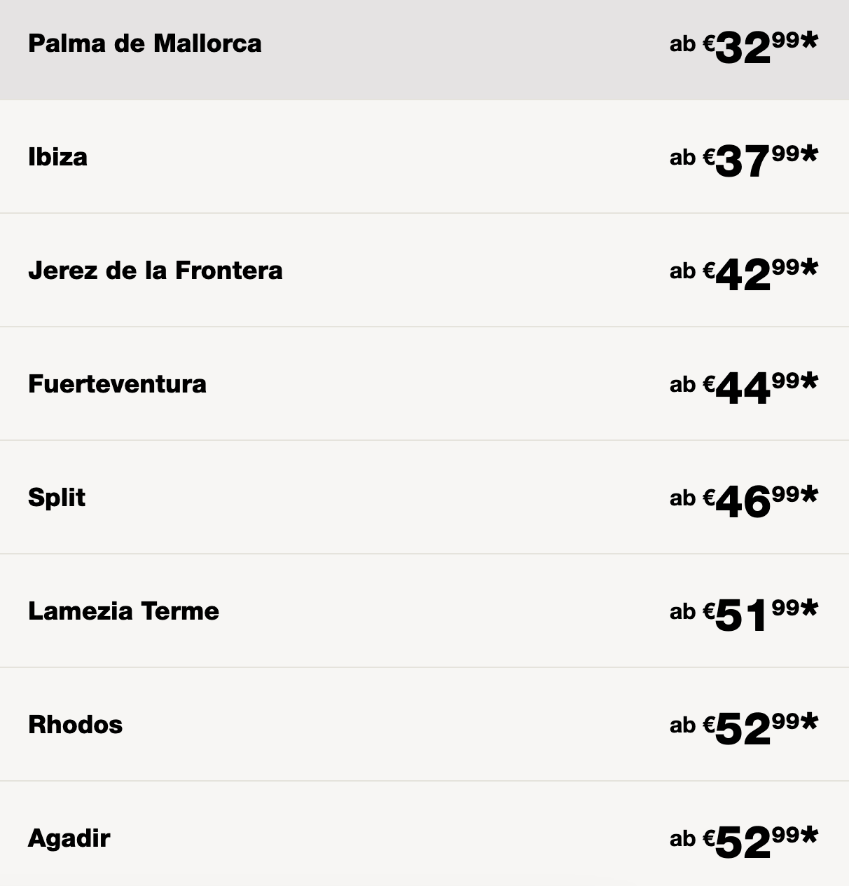 Die hier angepriesenen 52,99€ konnten bei der Recherche unterboten werden, wir haben u.a. einen Flug von Köln/Bonn (CGN) nach Mallorca (PMI) und wieder zurück schon für 49,98€ gefunden. Es handelt sich dabei um Flüge im restriktiven Economy Light Tarif. Neben den Reisen nach Mallorca sind auch zahlreiche andere Strecken auf Kurz-, Mittel- und Langstrecke zu finden.