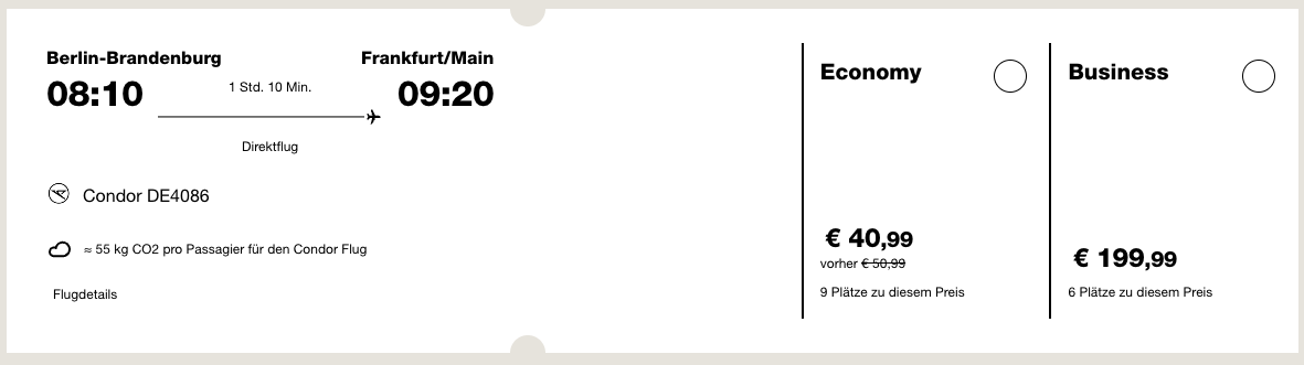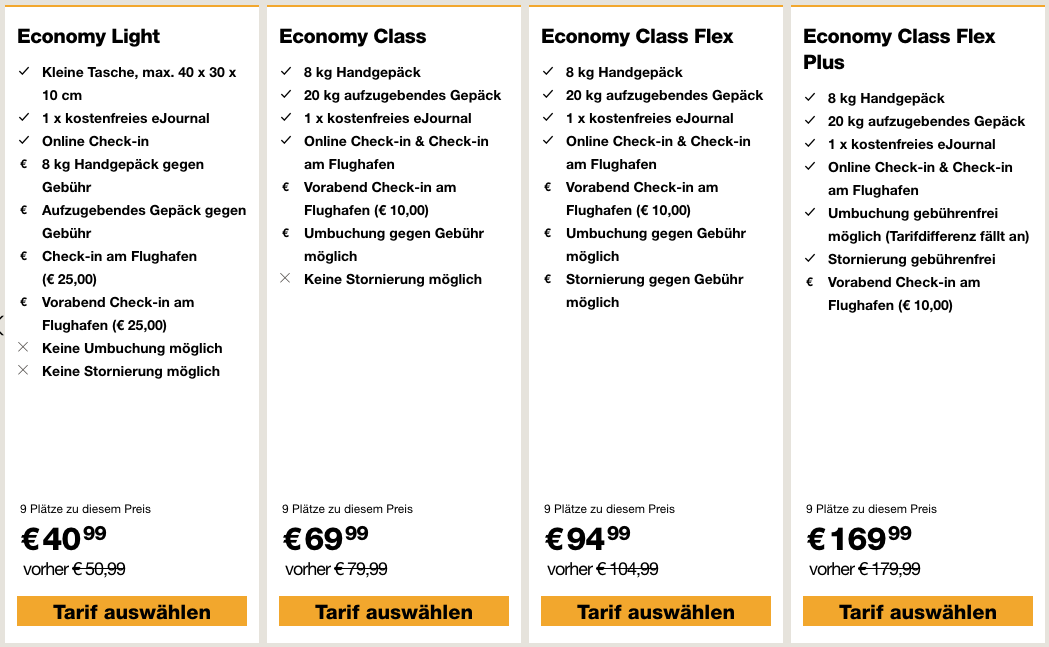 Am günstigsten sind die Flüge von Berlin nach Frankfurt, die anderen Routen sind je nach Richtung ab ca. 75 Euro zu haben. Dabei handelt um den günstigsten Economy Light Tarif, dieser ist restriktiv und beinhaltet kein Aufgabegepäck. Weitere Zusatzleistungen können gegen Aufpreis gebucht werden, in dem Fall macht es aber meist mehr Sinn einen hochwertigeren Tarif zu wählen.