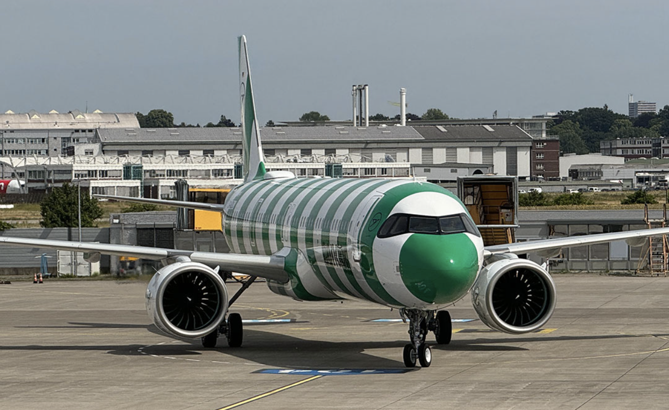 Der mit D-ANMZ registrierte Jet mit grünen Ringelstreifen kam vom Hamburger Airbus Werk in Finkenwerder (XWF). Nach knapp einer Stunde erfolgte die Landung am künftigen Heimatflughafen. Die Überführung erfolgte am Nachmittag des 19. Juni als DE4825 und ist bei Flightradar nachzuverfolgen.