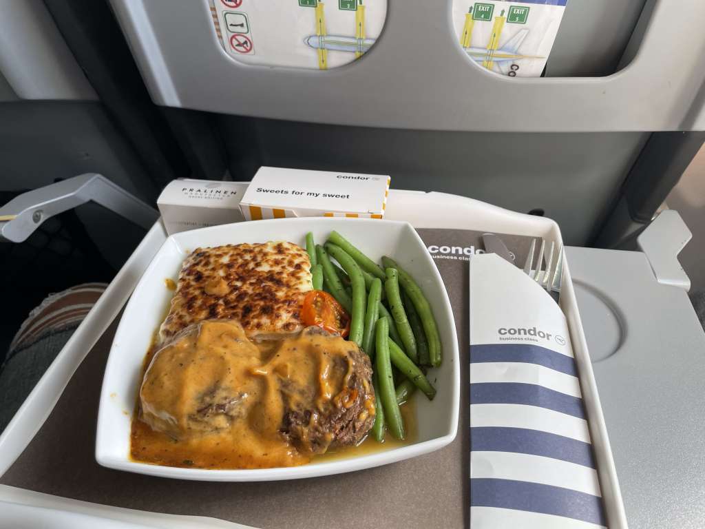 Theoretisch ist es möglich, im Vorfeld ein Premium-Menü zu bestellen, wie es in der Premium-Economy-Class serviert wird. Das Angebot kenne ich mittlerweile ganz gut, und mein Favorit ist der Rinderbraten. Die Gerichte haben jedoch alle ein wenig den Charme eines Mikrowellen-Fertiggerichts und sind für zwei bis drei Stunden Flugzeit gut – für mehr aber auch nicht.