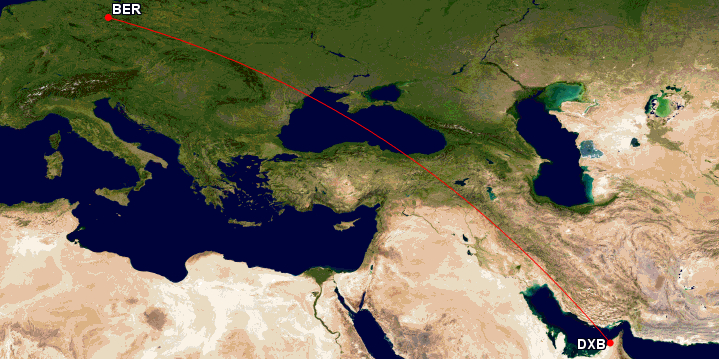 Berlin – Dubai ist ein ziemlich langer Flug für einen Airbus A320neo. Screenshot: gcmap.com