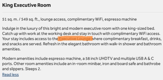 Für Stammgäste mit Hilton Honors-Status gibt es eine ganz besondere Überraschung. Während bisher jeglicher Hinweis auf eine Executive Lounge fehlte, sind nun auch Executive Rooms buchbar. In der Beschreibung dieser Zimmer findet sich ein Hinweis auf „Zugang zur Executive Lounge“ inklusive kostenlosem Frühstück, Getränken und Snacks.