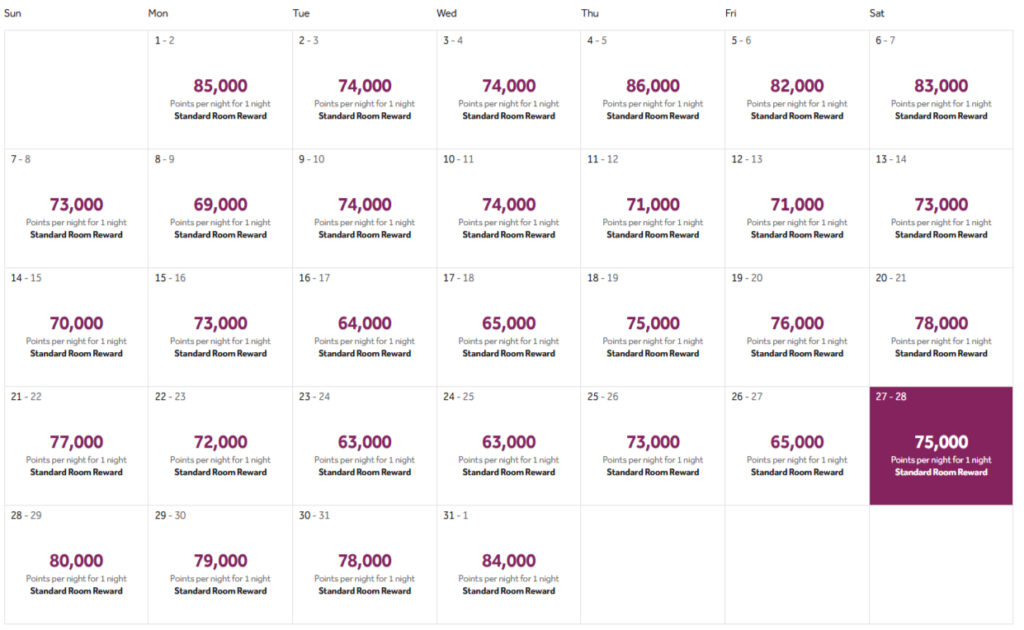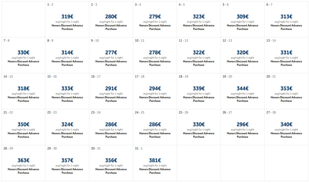 Je nach Datum bewegt sich die nicht stornierbare Honors Discount Rate zwischen den besagten 261 Euro und 381 Euro in der Silvesternacht. Punkteraten liegen im Bereich von 63.000 bis 85.000 Punkten für ein Standardzimmer. Premium Room Rewards sind deutlich teurer. Fünf zusammenhängende Nächte für den „Fifth Night Free Award“ sind noch ausreichend verfügbar. Obwohl Hilton Honors die Punkte normalerweise umsatzbasiert berechnet, ist keine 1:1-Korrelation zwischen Cash- und Punktebuchung erkennbar.