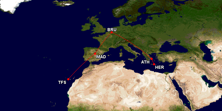 Also noch ein weiteres mal umsteigen, inklusive dem Wechsel der Airline und zwei unterschiedlichen Buchungen. Der schnellste und einzig machbare Weg an diesem Tag war also ein Trip mit Aegean von Heraklion über Athen nach Brüssel und von dort dann mit Iberia via Madrid nach Teneriffa.