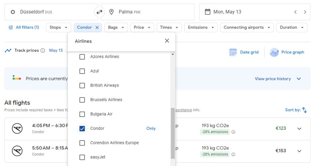 1. Ich suche zunächst bei Google Flights nach passenden Flügen (der Klassiker ist tatsächlich Palma de Mallorca).