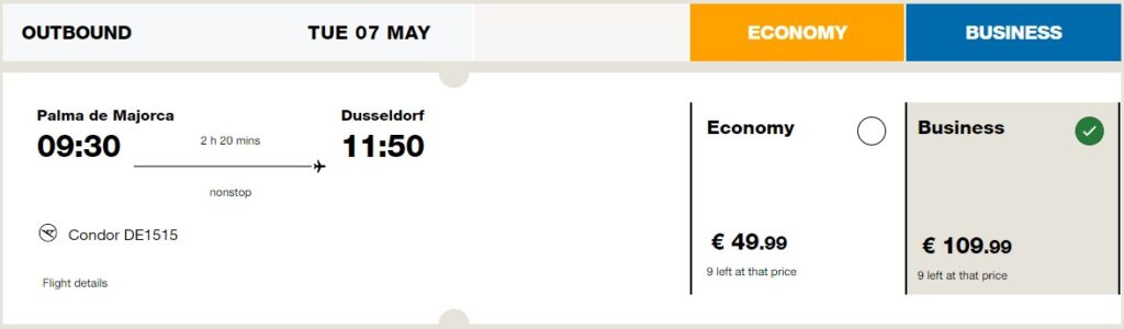 Hier ein konkretes Beispiel, bei dem ich einen 195 Euro Condor Business Class-Flug von Hamburg nach Mallorca gebucht habe. Der Flug in der Economy Class hätte mich 85 Euro gekostet, so dass ich hier mit nur 10 Euro Aufpreis Business Class fliegen kann: