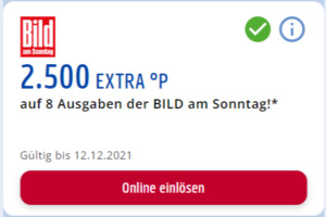 Möglich wird der günstige Meilenkauf mal wieder durch ein Abo-Angebot. Bei Payback findet Ihr im Bereich eCoupons derzeit einen Gutschein für die „Bild am Sonntag“. Dort könnt Ihr acht Wochen lang die Sonntagszeitung aus dem Axel Springer Verlag frei Haus bestellen. Dafür zahlt nur 19,60 Euro. Und als Prämie gibt 2.500 Payback Punkte, die wenige Wochen später auf Eurem Konto gutgeschrieben werden. Diese Payback-Punkte lassen sich, wie oben beschrieben, noch 1:1 in Miles & More Prämienmeilen verwandeln.