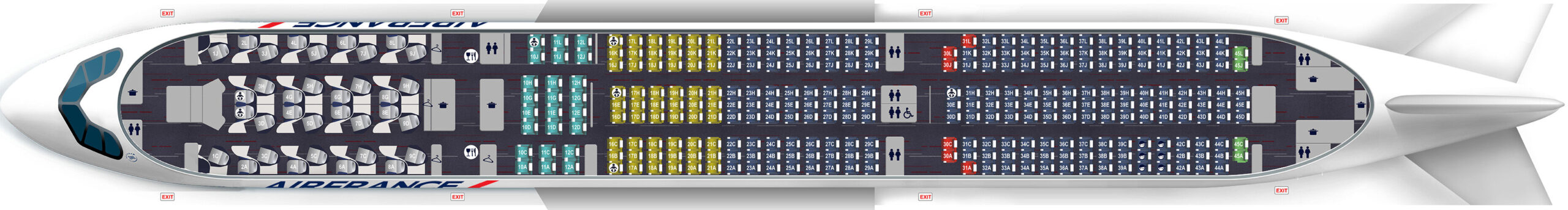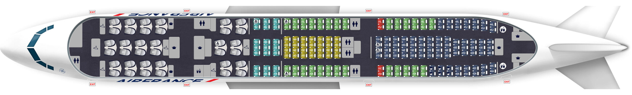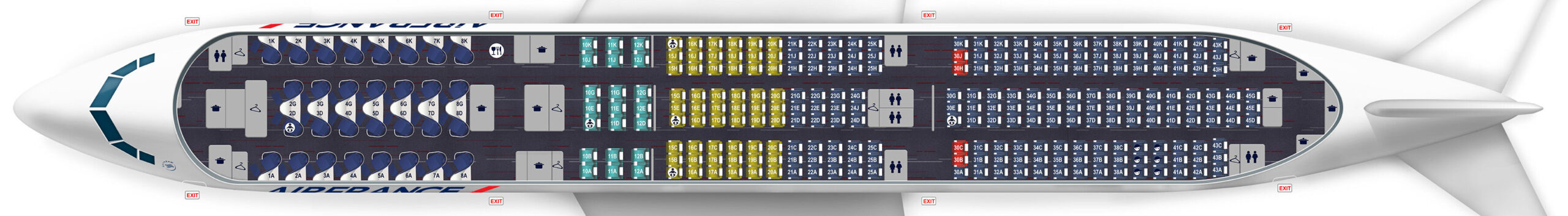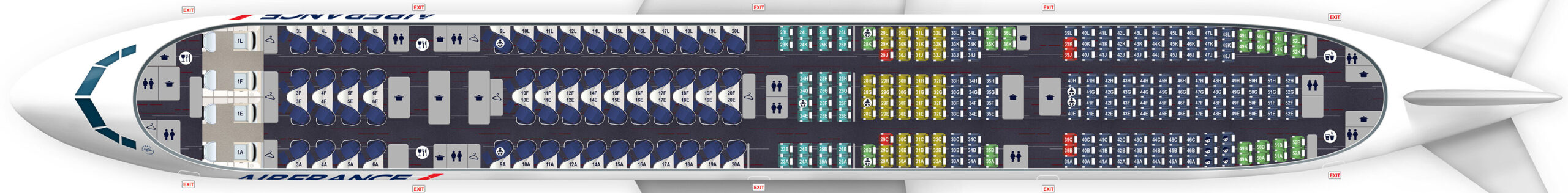 Sie sind und bleiben mit 43 Maschinen das Rückgrat der Franzosen, in einer speziellen Variante für Holiday-Flüge gibt es nur eine kleine Business Class. Neben den 14 Business-Sesseln im vorderen Bereich sind 28 Premium Economy Sitze und 430 reguläre Eco-Plätze. In einer anderen Variante hat man nur 206 Plätze in der Holzklasse, dafür sind aber 58 Business Sitze verfügbar.