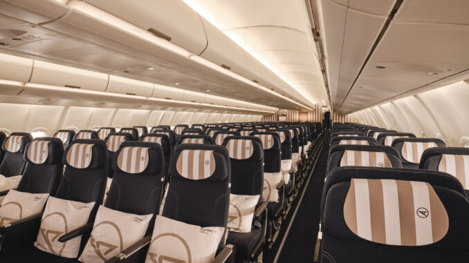Auch dort findet man das aktuelle Ringel-/Streifen Design. Insgesamt sind 310 Sitzplätze vorhanden, davon fallen 216 in die Economy und 64 in eine leicht komfortablere Premium Economy Class. In der Business Class sind 30 Sitze verbaut, die vier in der ersten Reihe werden als „Prime Seats“ vermarktet.