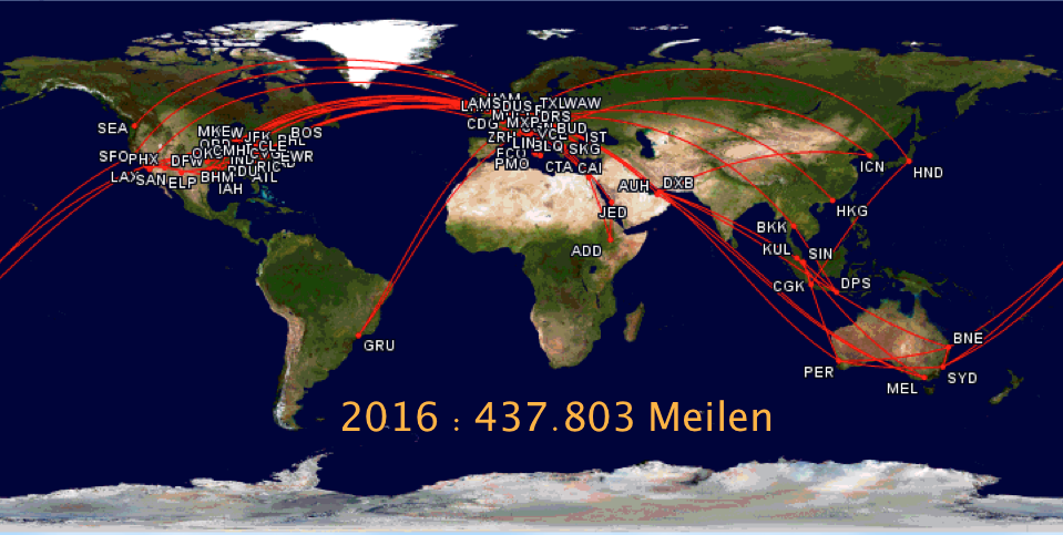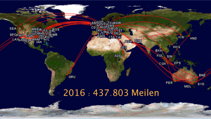 Mein Vielfliegerjahr 2016 lässt sich in nüchternen Zahlen mit 180 Flügen und 437.803 zurückgelegten Meilen beschreiben.