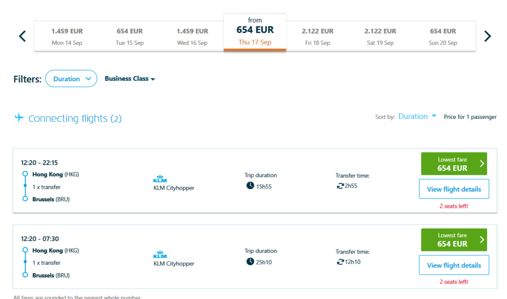 Auch bei Flugpreisen gilt häufig: wer dann fliegt, wenn kein anderer will, kann gute Deals bekommen. In diesem Fall geht es mit der niederländischen KLM von Brüssel (BRU) nach Hong Kong (HKG) in der Business Class. Mit einem Preis von nur 1.240 EUR ist das für einen Flug in der Business Class sehr günstig. Außerdem reichen die auf diesen Flügen gesammelten XP-Punkte zum Flying Blue Silber Status.