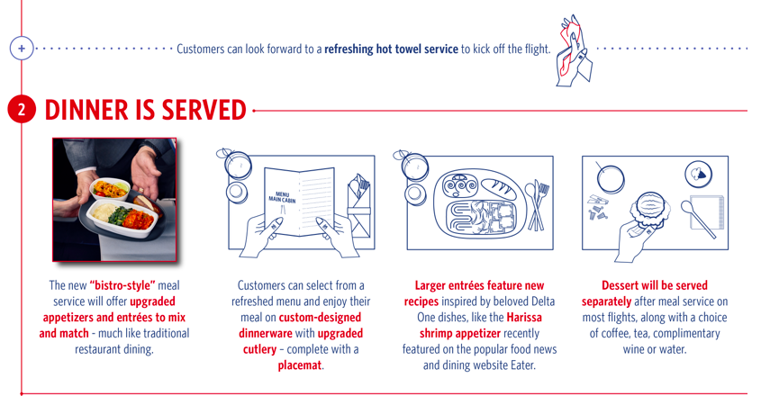 Bei den angebotenen Speisen will man sich übrigens von den Rezepten inspirieren lassen, welche man bereits aus der Delta one Business Class kennt.
