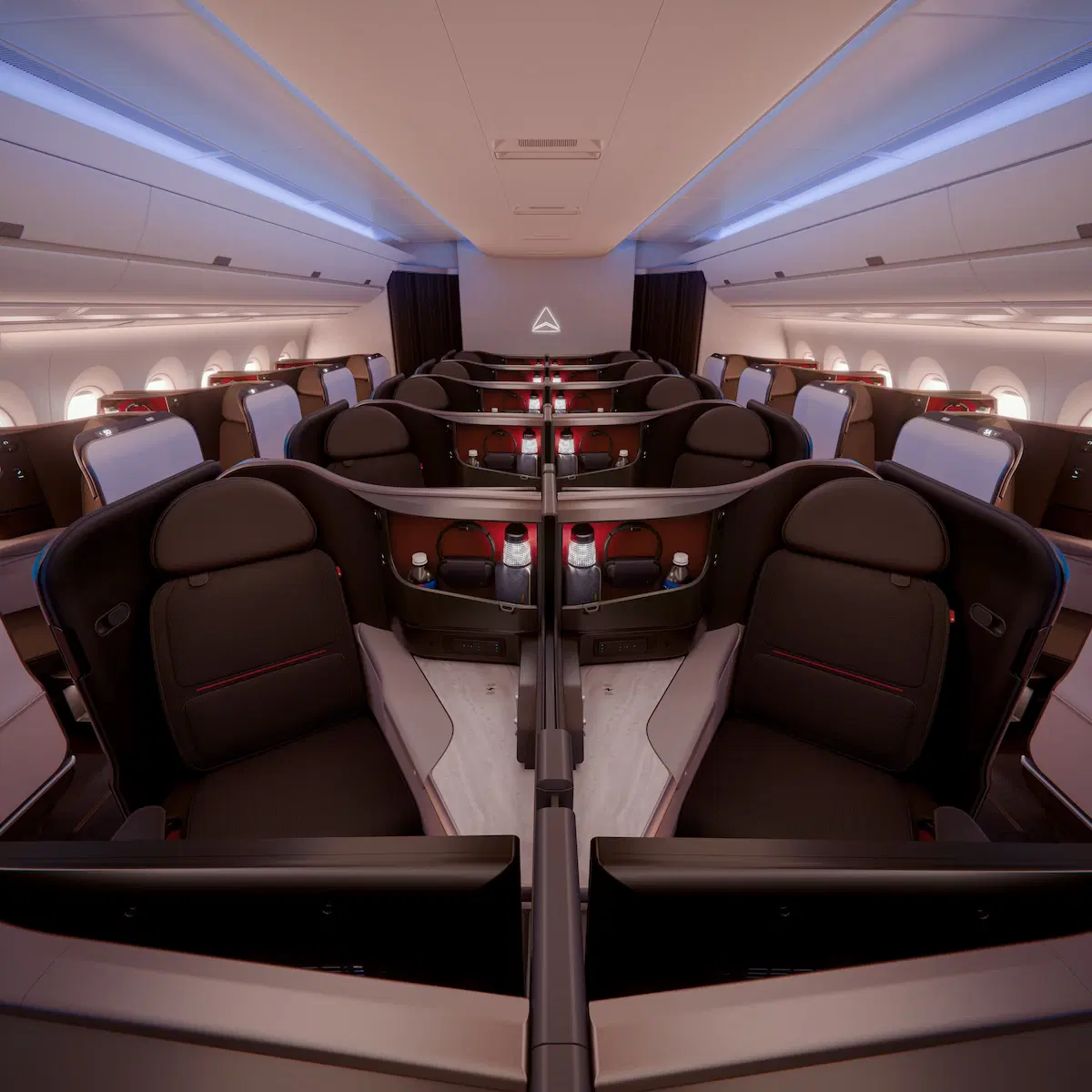 Was aber auffällt, ist, dass Delta Airlines die Farbwelt überarbeitet und dunkler wird. Während aktuell die Kabinen von Delta eher blau gehalten sind, wird man in Zukunft deutlich dunkler (aber auch moderner) unterwegs sein. Mir persönlich gefällt durchaus, was Delta Airlines hier zeigt!
