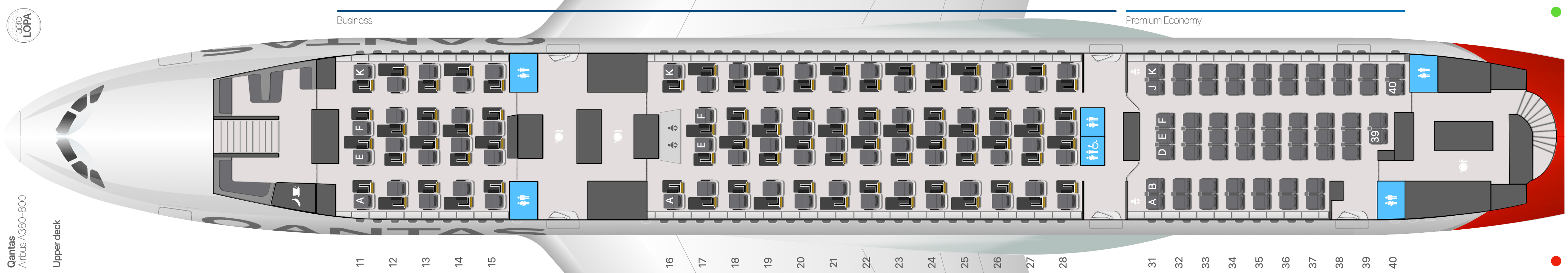 Diese Business Class Sitze sollten bei Lufthansa allerdings eine gewisse Reduzierung der Kapazität in der Business Class mit sich bringen, denn wenn man die Seat Map der Lufthansa Airbus A380 (oben) und des Qantas Airbus A380 mit der neuen Business Class gegenüber stellt, sieht man, dass Lufthansa hier aktuell im mittleren Compartment 54 Sitze verbaut hat, während Qantas nur auf 50 Sitze kommt.