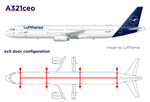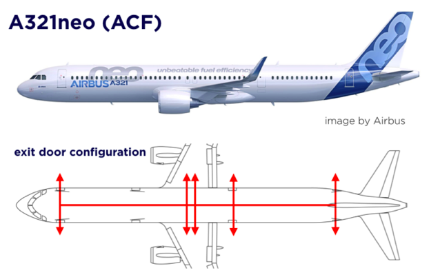 Normalerweise verfügt ein Airbus A321 über vier Türen auf jeder Seite. Bei den Airbus A321neo mit Cabin Flex Configuration wurde die zweite Tür vor dem Flügel entfernt und dafür insgesamt vier Notfenster über dem Flügel installiert. Hierdurch hat man nun mehr Platz in der Kabine und das Flugzeug ist für bis zu 240 Passagiere zugelassen.