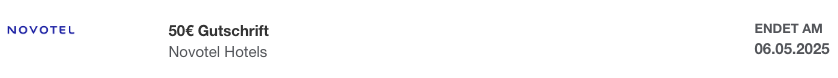 Wer eine American Express Kreditkarte hat, sollte bei den Offers nachsehen, ob dieses Angebot von Novotel dabei ist. Damit könnt Ihr Euch bei teilnehmenden Hotels der Marke Novotel ein Cashback von 50 Euro sichern. Dazu müsst Ihr lediglich das Angebot aktivieren und mindestens 200 Euro Umsatz generieren.
