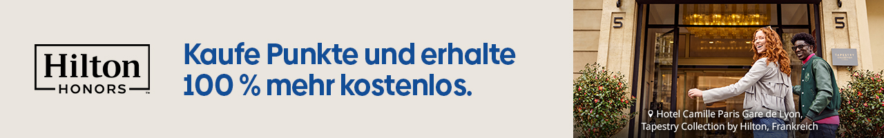Hilton bietet regelmäßig Aktionen beim Punktekauf im Honors-Programm an. Ab und an gibt es ein Extra auf den Punktewert, manchmal sind die Preise reduziert. Aktuell erhaltet Ihr einen Bonus von 100 Prozent, damit sind bis zu 480.000 Punkte möglich.