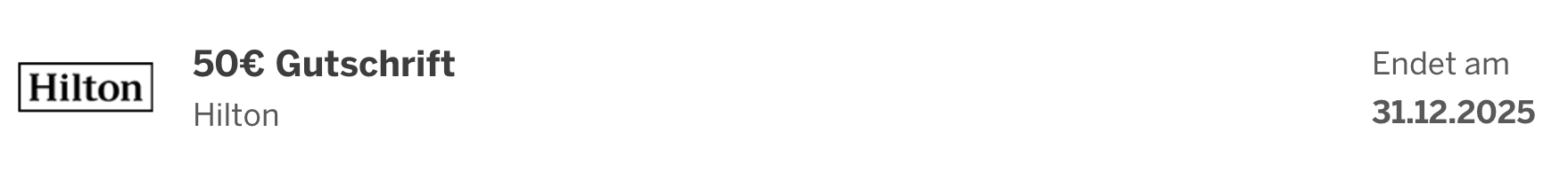 Angebot aktivieren, bis zum 31/12/2025 bei teilnehmenden Hilton Hotels insgesamt mindestens 200€ ausgeben und einmalig 50€ Gutschrift erhalten.