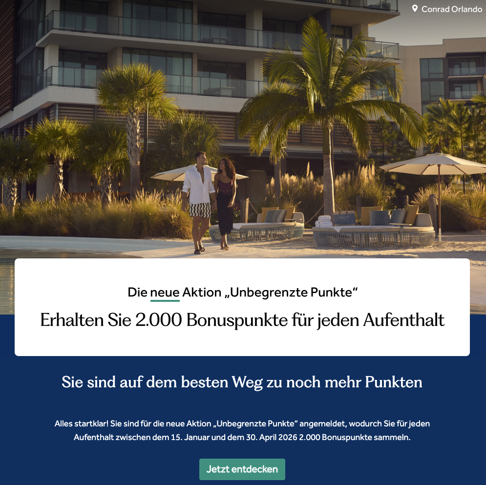 Unter dem Titel „Points Unlimited“ zündete Hilton Honors die erste Punkterakete im neuen Jahr. Die Promotion läuft noch bis zum 30. April 2026. In diesem Zeitraum werden Euch nach einem punkteberechtigten Aufenthalt in jedem Hilton Hotel auf der Welt 2.000 Bonuspunkte gutgeschrieben. Es gibt auch kein Limit für die Anzahl der Bonuspunkte bei dieser Promotion.