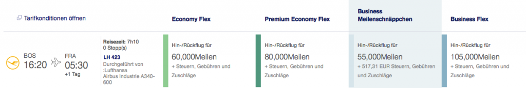 Boston in der Lufthansa Business Class für 55.000 Meilen