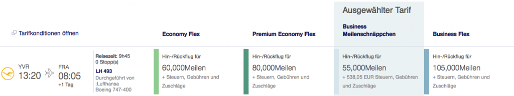 Wow! Frankfurt – Vancouver. Ein 10h-Flug in der Busibess für 55000 Meilen + 538 Euro. Das sind bei Preisen von ca 3900 Euro Normaltarif, ca 6 Cent pro Meile~~ einen so hohen Wert hat man nicht alle Tage.. nur schade, dass ich gerade nichts in Vancouver vorhabe^^