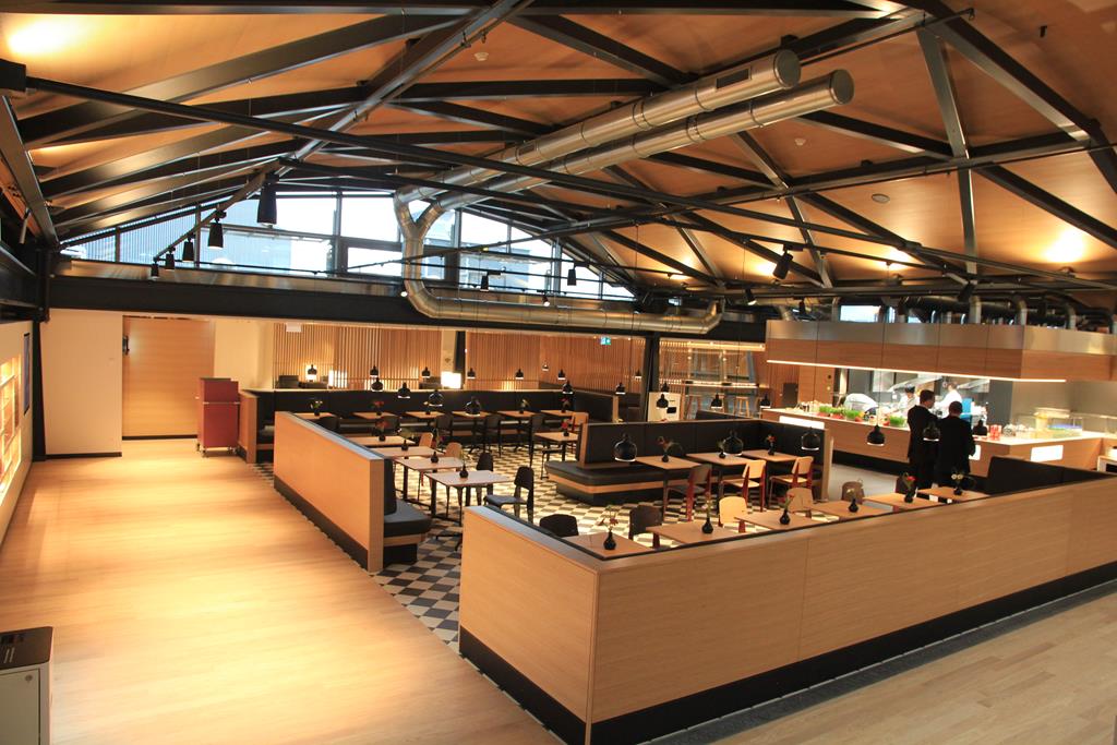Der Verpflegungsbereich ähnelt ein wenig einer klassischen Markthalle, insbesondere die hohen Decken und massive Metallstrukturen tragen zu dieser offenen Atmosphäre bei. Gäste können sich an einer Live-Cooking Station, sowie an einem Buffet zur Selbstbedienung verpflegen.