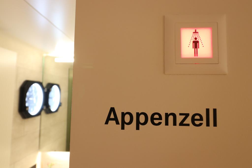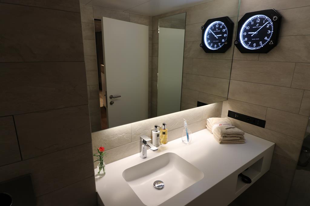 Die Waschräume teilen sich die Gäste der Senator- und der Business Class Lounge. Diese befinden sich im Eingangsbereich. Hier befinden sich ebenfalls fünf Badezimmer mit Duschen. Nettes Detail: Jeder der Duschen trägt einen eigenen Namen, verwendet wurden hierfür Ortschaften in der Schweiz. Neben hochwertigen Rituals-Amenities werden ebenfalls komfortable Handtücher gereicht.