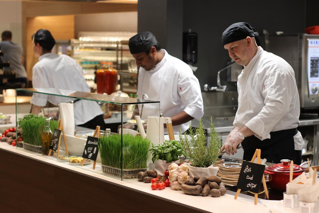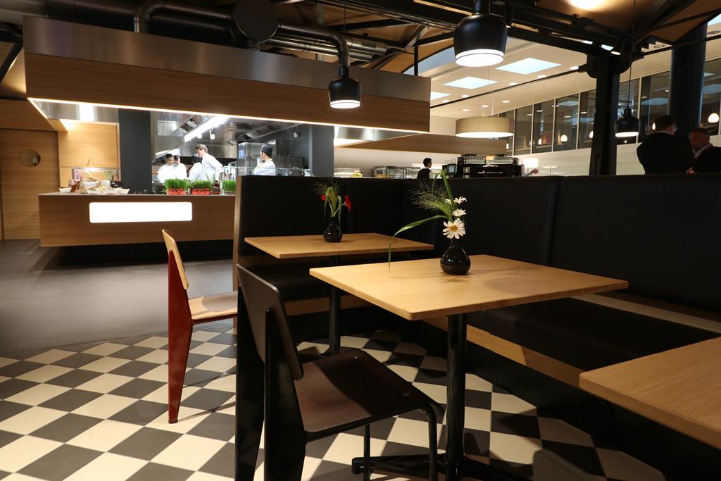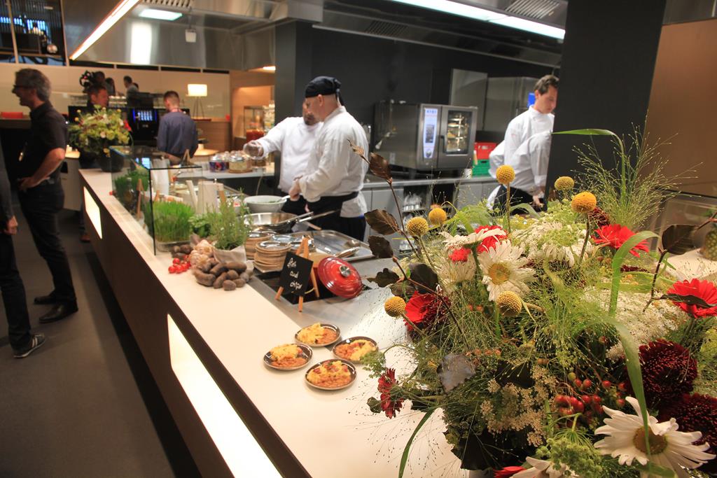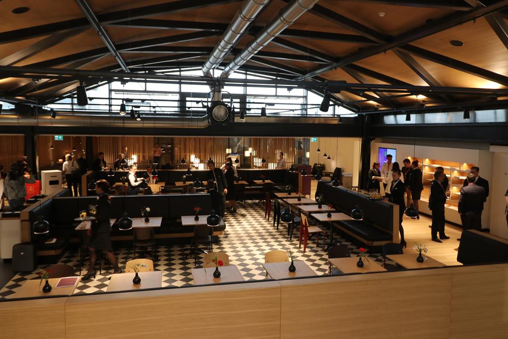 Der Verpflegungsbereich ähnelt ein wenig einer klassischen Markthalle, insbesondere die hohen Decken und massive Metallstrukturen tragen zu dieser offenen Atmosphäre bei. Gäste können sich an einer Live-Cooking Station, sowie an einem Buffet zur Selbstbedienung verpflegen.