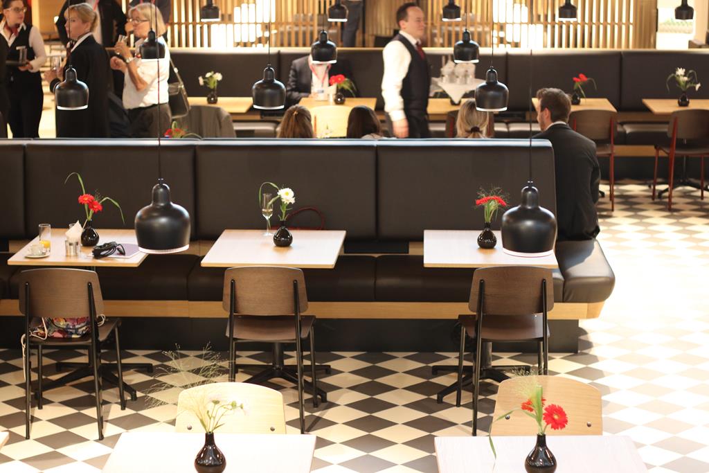 Der Bereich bietet ausreichend Sitzmöglichkeiten zum Essen, Unterhalten, oder auch Arbeiten.