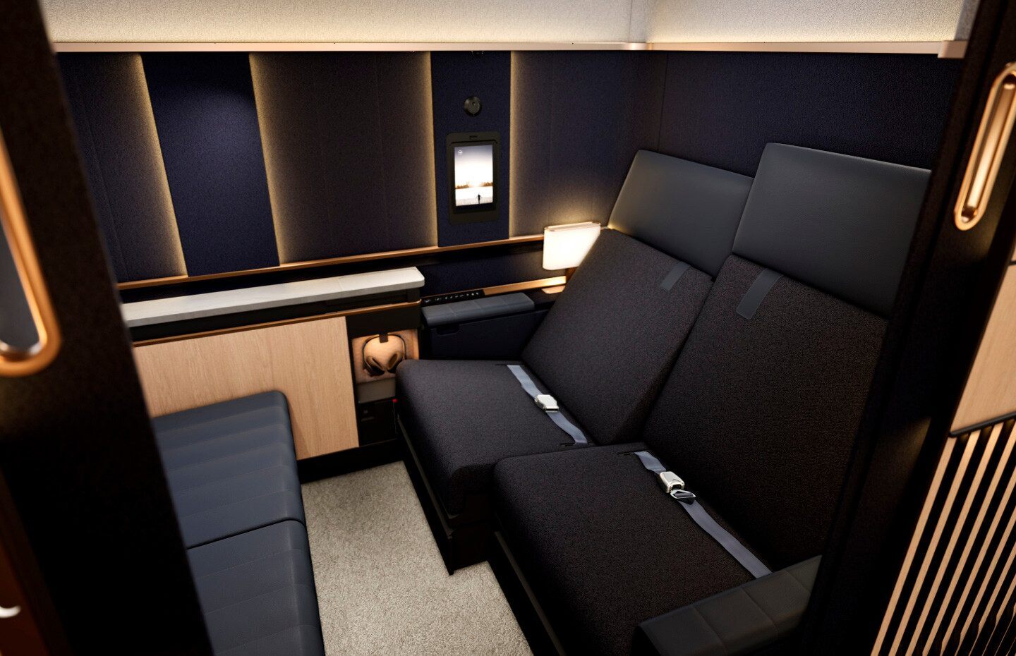 Die mittlere Suite ist wahlweise auch für zwei gemeinsam Reisende ausgelegt und Lufthansa hat das Konzept der First Suite Plus, welche man mit bis zu zwei Passagieren belegen kann, bereits gezeigt. Swiss wird diese Kabine genau so auch bekommen.