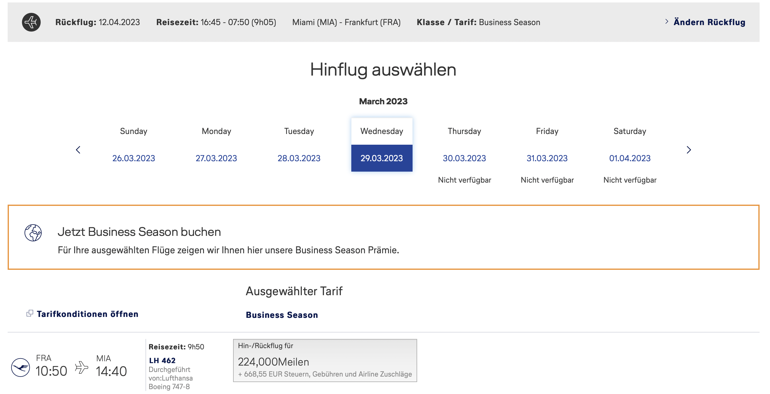 Buchbar sind die Miles&More Business Season Awards aktuell nur zwischen dem 21.12.2022 und dem 28.02.2023 und gelten für den Reisezeitraum zwischen dem 01.03.2023 und dem 30.04.2023. Damit geht der Reisezeitraum auch über die Osterferien und auch da findet man tatsächlich eine gute Verfügbarkeit.