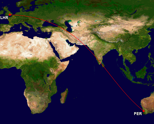 Der Flug zwischen Perth im Westen von Australien und London Heathrow erstreckt sich über eine Distanz von 9.009 Meilen oder fast 15.000 Kilometer. Geflogen wird mit einer Boeing 787-9, welche mit Business Class, Premium Economy und Economy Sitzen ausgestattet sind. Die durchschnittliche Flugzeit liegt bei etwa 17 Stunden.