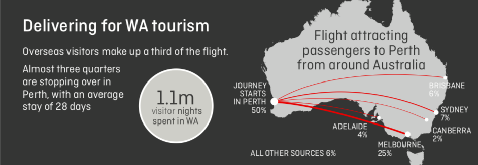 Besonders hoch hängt Qantas die Bedeutung dieses Fluges für die Wirtschaftsregion von West Australien. So legen interessanterweise 3/4 aller Passagiere einen Stopover in Perth ein, sodass dieser Flug insgesammt für 1.1 Millionen zusätzliche Hotelnächte in der Region verantwortlich sei.