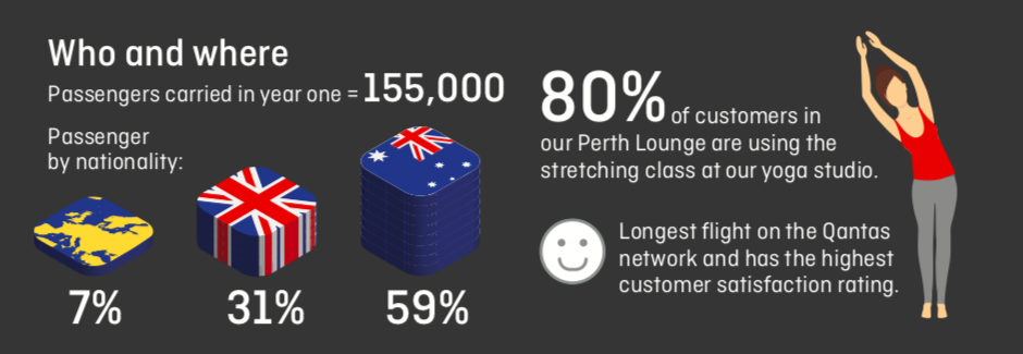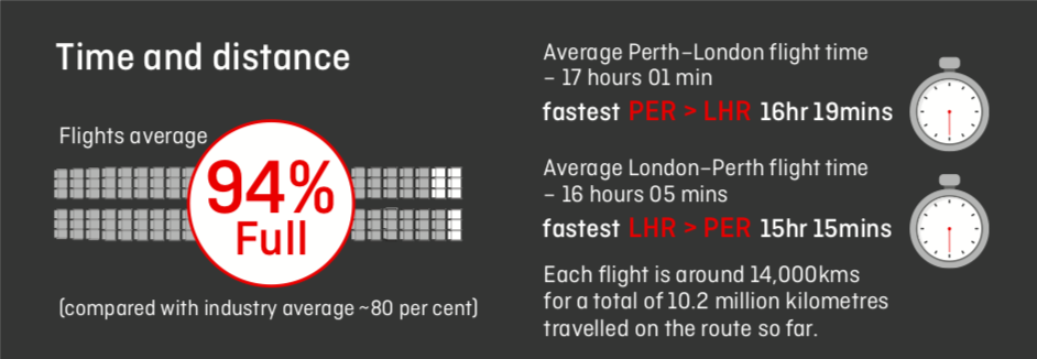 • In dem ersten Jahr des Bestehnes der Strecke zwischen Perth und London sind 155.000 Passagiere auf diesem Flug geflogen. Damit lag die durchschnittliche Auslastung bei 94 Prozent, was extrem beeindruckend ist.