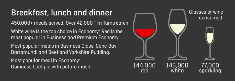 • 42.000 Tim Tams Schokoriegel wurden auf dem Flug im letzten Jahr gegessen.