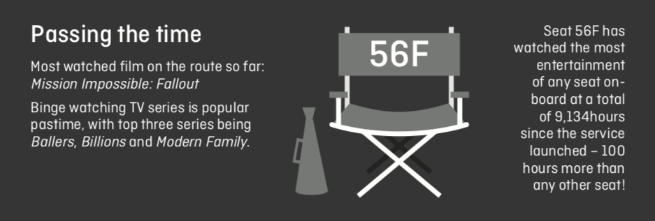 • Lustig ist, dass Sitz 56F mit Abstand am meisten Filme geschaut hat. Auf diesem Sitz liefen im letzten Jahr 9.134 Stunden das IFE und damit 100 Stunden länger, als auf jedem anderen Sitz.
