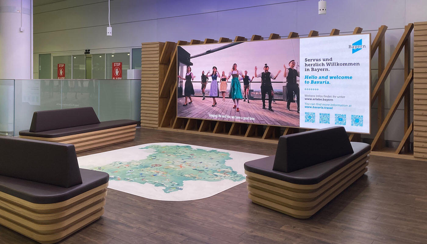 Die Bayern-Lounge im öffentlichen Abholer-/Wartebereich des Terminal 2 empfängt Gäste aus aller Welt. Direkt neben dem Ankommer-Ausgang auf Ebene 03 und unmittelbar verbunden mit der Käfer Genusswerkstatt lädt sie zum Verweilen im modernen bayerischen Ambiente ein. Eine große Medienwand bietet Reiseinspirationen rund um Deutschlands beliebtestes Urlaubsland und lässt Reisende bereits am Flughafen in das bayerische Lebensgefühl eintauchen