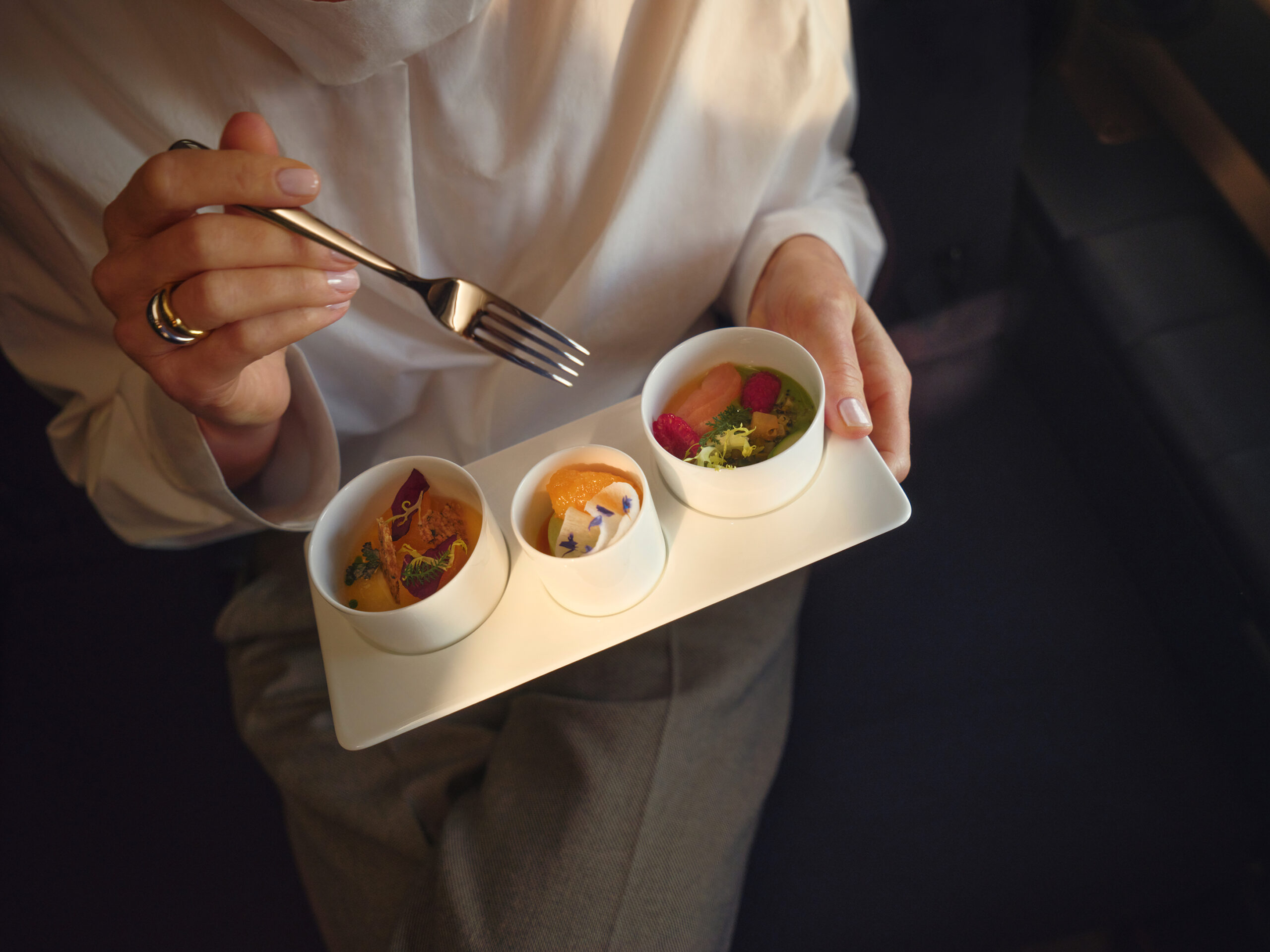 Bei den Vorspeisen bleibt sich der Lufthansa-First-Class-Service treu und man setzt hier weiterhin auf die Trilogie, die auf einem Teller serviert wird. Auch wenn ich dieses Konzept nicht schlecht finde, bin ich der Einzige, der die Etagere der Lufthansa First Class vermisst, die es noch vor einigen Jahren gab?