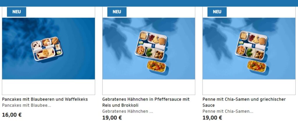 Die Preise sind mit 16 bis 19 Euro nicht ohne. Dafür gibt es aber auch nicht nur einen Hauptgang sondern auch Vorspeise und Dessert. Zum Vergleich: Bei Condor geht es schon ab 9,99 Euro los. Die Auswahl könnte für meinen Geschmack jedoch etwas umfangreicher sein. Ein sehr süßes Frühstück und zwei Mittag- bzw. Abendessen – eins davon auch noch vegetarisch – sind dann doch etwas wenig.