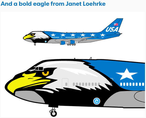 Die USA Today hat einige Design Vorschläge veröffentlicht, mit welchen man sich offen über Präsident Trump lustig macht, welcher eine neue Bemalung des Flugzeuges zur Chefsache erklärt hat. Zwar gibt es keine Informationen, was Donald Trump gerne auf der Air Force One sehen würde, hier sind allerdings die sehr überzogenen, aber auch amerikanischen Vorschläge der USA Today.