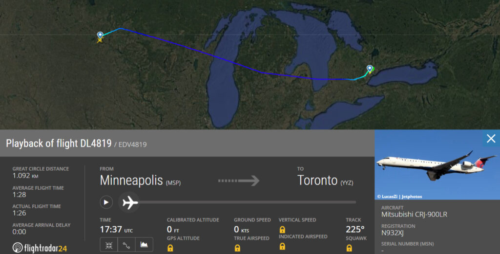 Laut Medienberichten handelt es sich bei der verunglückten Maschine um eine Mitsubishi CRJ900LR des Delta Air Lines Partners Endeavor Air. Das Flugzeug kann bis zu 76 Passagiere befördern und war am Montag für den Flug DL4819 von Minneapolis (MSP) nach Toronto eingesetzt. Die CRJ900 mit der Registrierung N932XJ war mit etwa 75 Minuten Verspätung in den USA gestartet. Sie landete um 14:13 Uhr, als es zu dem Vorfall kam.