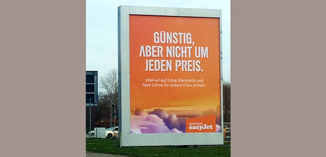 „Günstige, aber nicht um jeden Preis“ schreibt EasyJet in großen Lettern auf dem Plakat in Berlin. Darunter steht als Erklärung: „Weil wir auf hohe Standards und faire Löhne für unsere Crew achten“