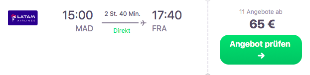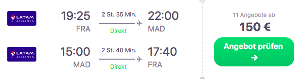 Übrigens kann man auch in der LATAM Economy Class einen Hin- und Rückflug nach Madrid für ab 72 Euro buchen.